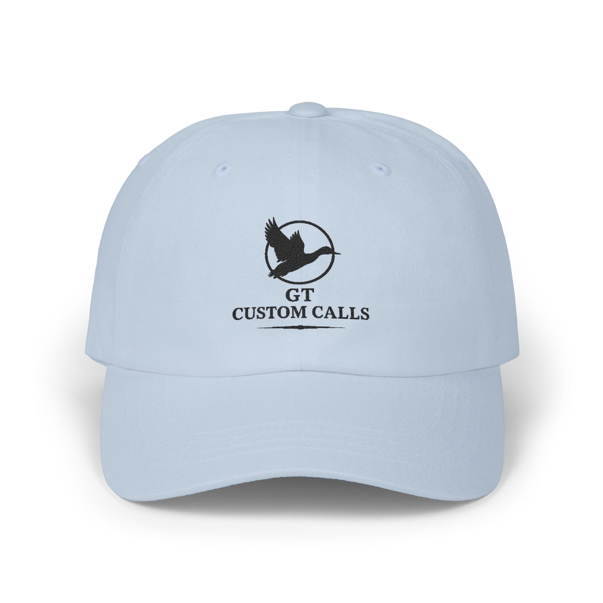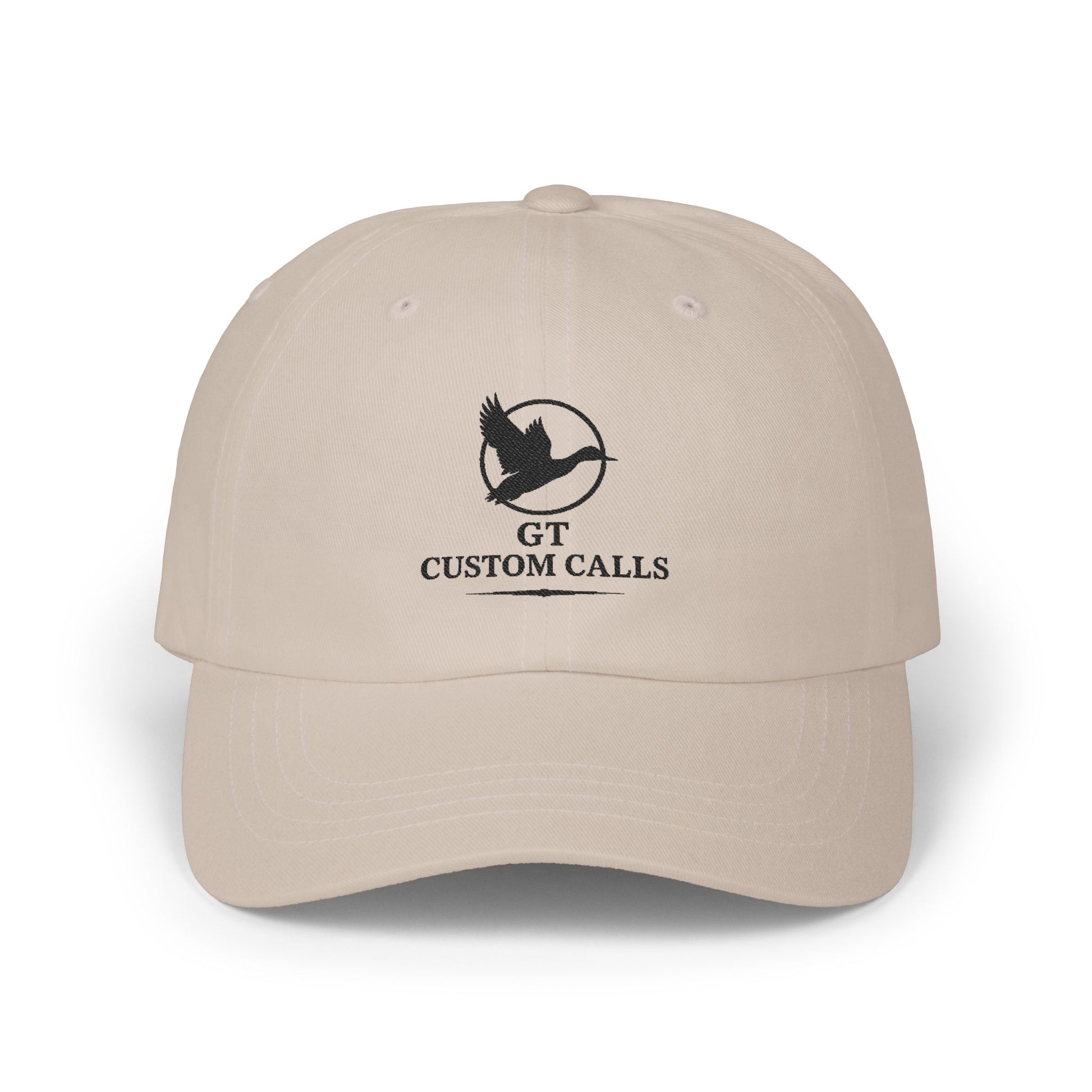 A laid-back, classic dad cap embroidered with a simple goose-in-flight logo and the text "GT CUSTOM CALLS." Lightweight and slightly slouchy, it settles comfortably on the head for all-day wear. The precurved visor shields your eyes while the muted underbill keeps glare low. An antique-brass hideaway strap lets you fine-tune the fit without sacrificing the cap's clean silhouette. This hat slips into mornings at the marsh, evenings at the blind, or quick runs into town — a quiet piece that speaks to people who spend time outdoors and value function over flash.